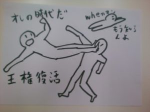 王ふたりで協力していい国にしていこう、という発想がまったくない彼ら、熾烈な闘いが続きます。しかし両者の実力は同じなので勝敗がつきません。グラウンドでの膠着状態が延々と続いています。このままでは内戦が長期化、この国は滅んでしまうのかー。
