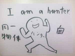 I と a hunter は同一物体です。絵をかくとひとりだけです。やられ物体がないので、ネイティブは受動態にする気なんておきません。be動詞(ワーグナーミトミ英語では be王)の受動態がないのは、当然だったのです。
