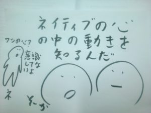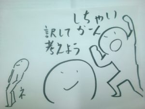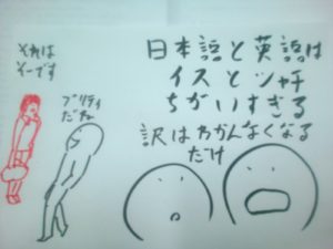 サトル君が日本語に訳して考えようとしたその時、あの放浪の英語コーチが早くも登場しました。放浪してるにしては、よくサトル君とでくわしますが。なにやら