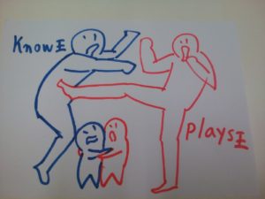 同じ物体、青のthe place と 赤のthe place が合体したので、ネイティブの同じ物体合体欲は満足しました。しかし、この合体により、青のknow と 赤のlikes というふたつの動詞、ワーグナーミトミ流でふたりの王が存在することになりました。ふたりの王は協力するという発想そのものがないので、ただひとりの王になるため闘います。