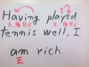 Whenマン にかわり ingマン で eat の王権を停止しました。これでも王である動詞は feel 1語だけです。こちらでもOKです。サトル君、余裕の正解です。お、次の問題です。