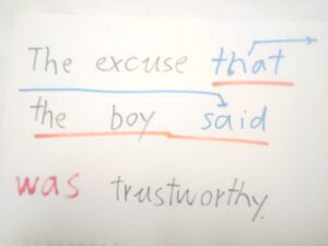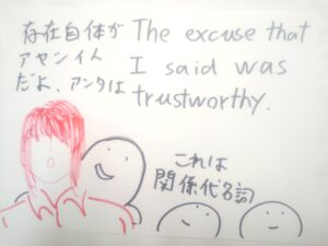 こうして、関係代名詞の主格のケースを同じ状態になったところで、関係代名詞 that が英語ネイティブの方の心に浮かび、追加情報文の the excuse にとって代わります。