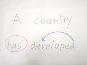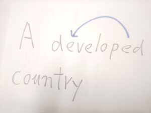 過去分詞の developed なんざ形容詞なので、a と country の間に入れるのは、英語ネイティブには当たり前のことです。
