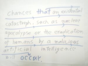 これでひとつの文です。この位の長さ、英検1級では当然です。この当然さにお手上げ状態になってしまっているのが、多くの日本語ネイティブ英語学習者です。まあ現行英文法(天動説英文法)でこの文の解析をしていたら、そりゃたまらないでしょう。