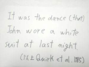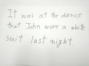 d. It was at the dance that John wore a white suit last night.