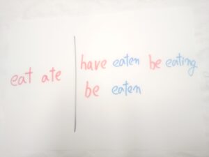 現行の天動説英文法の動詞の活用です。すべての英語指導者の英文法は、この動詞の活用を土台としています。このすべて動詞の動詞の活用が、英文法の大混乱のスタートです。