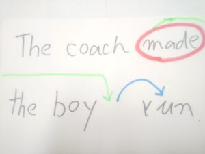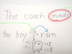 という文構造です。あれ?使役動詞 made から、グリーンのラインが出ていますよ。これが通りすがりのあんちゃんが言ってたグリーンラインですな。
