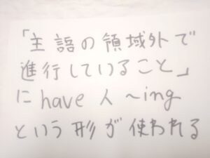 注4 「主語の領域外で進行していること」に have – ing という形が使われる。I won’t have you talking to me like that. 「君にそんな口にきき方をさせるわけにはいかない」