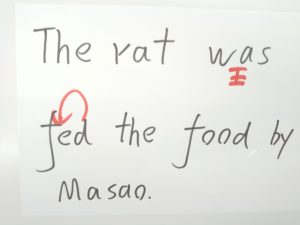 受動態にするとこうなります。give のように物体2連ちゃんで英語ネイティブの心に浮かぶので、2連ちゃんのふたつめの物体 the food が 過去分詞 fed の直後に残るわけです。これが過去形の fed がふたつあるように、日本語ネイティブに見える原因です。