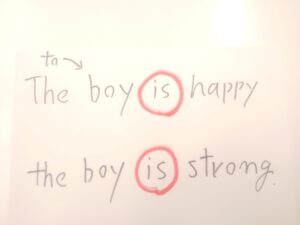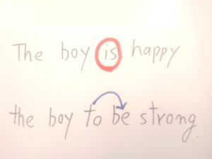 生存可能状態になってみると、the boy を繰り返さなくても、動詞(王)太陽 のある is のほうでもう The boy とすでに言ってるので、不定詞 to で落ちぶれた to be のほうの the boy は、透明バージョンにしてしまいます。透明バージョンで英語ネイティブ同士わかっちゃいますから。