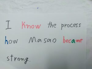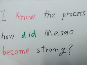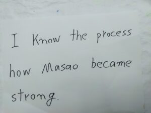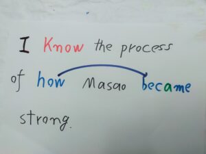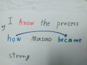 前置詞 of が the process と how Masao became strong の間に入り、両者を前置詞つなぎしました。この状態で英語ネイティブの方々から発信されます。