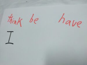 これが初期も初期の最初の段階です。3つの動詞が出現です。しかし、このまま3つの動詞に来られては、太陽系に太陽が3つの生存不能状態になります。そこで英語ネイティブの方々が生まれつき持つ英語本能が無意識に行うのが