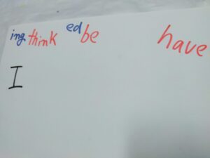 を奪取してしまいます。そのあとに到着する be が I を見て対応した am にブルーed が、think に ブルーing がへばりつきます。こうして