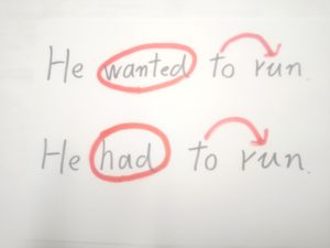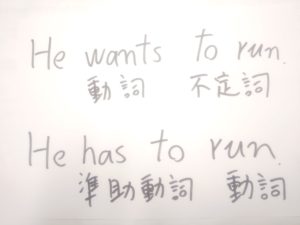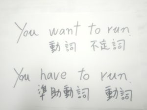 want to run の to run は不定詞で、have to run の run が動詞