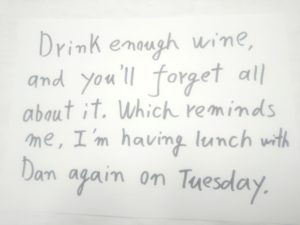 (5)Drink enough wine, and you’ll forget about it. Which reminds me, I’m having lunch with Dan again on Tuesday. ( Steel, Bittersweet)