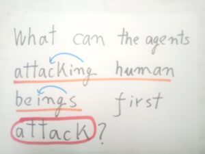 という文構造です。英語ネイティブの方々はこの追加情報を、基本スタート文の the agents の後ろに突っ込んでしまいます。