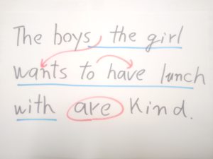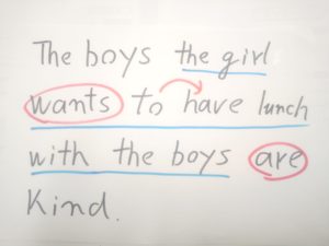 The boys と the girl の間に whom があるな