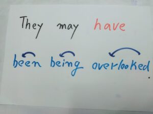 上の「助動詞+本動詞」のおパラダイムにおいて、一番右側にくるのが本動詞、その左側にくるのがすべて助動詞である. 大事な点は、助動詞はこの順序に並ぶ、ということである。huddleston&Pullum (2002:106)は、進行の be と受動の be が共起する(?)を付した構造は、話し手の中には避ける向きもあるが、実際にはときどき見いだされるとして、(2)の例を示している。