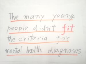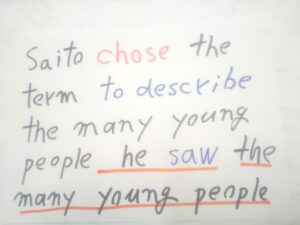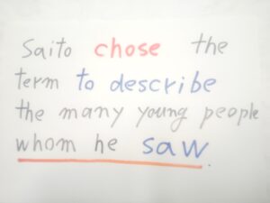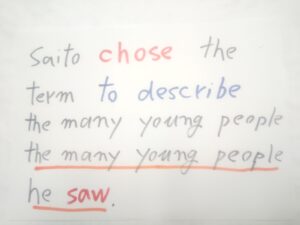 追加情報2号が本体に入りました。すでに入っている追加情報を乱せないので、その後ろに入ります。本体の the young people と離れていますが、これはもう仕方ありません。英語ネイティブの方々がこれでよし、としています。無意識ですが。お、関係代名詞 whom が透明バージョンになりました。